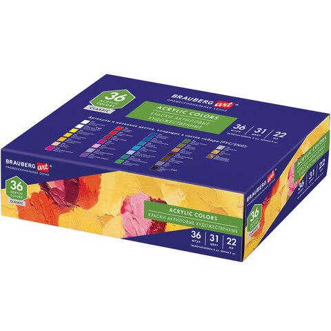 Краски акриловые художественные, НАБОР 36 штук, 31 цвет, в тубах по 22 мл, BRAUBERG ART CLASSIC, 192245