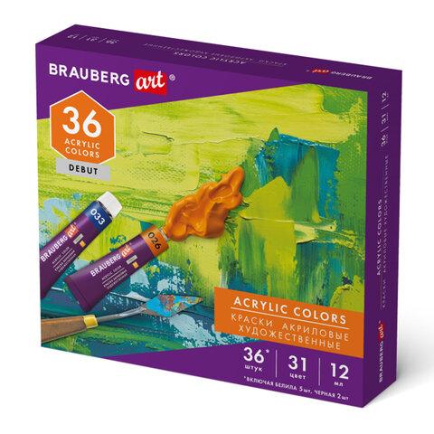 Краски акриловые художественные НАБОР 36 штук, 31 цвет по 12 мл в тубах, BRAUBERG ART DEBUT, 192294