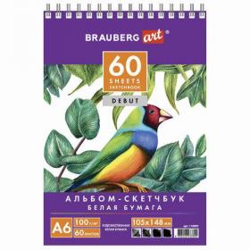 Скетчбук, белая бумага 100 г / м2, 105х148 мм, 60 л., гребень, жёсткая подложка, BRAUBERG ART DEBUT, 110997