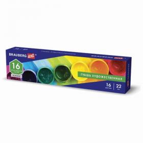 Гуашь художественная BRAUBERG ART CLASSIC, НАБОР 16 цветов в баночках по 22 мл, 191584