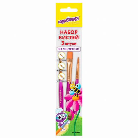 Кисти ЮНЛАНДИЯ, набор 3 шт. (СИНТЕТИКА: круглые № 1, 2; плоская № 3), пакет с европодвесом, 200886