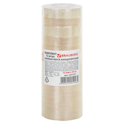 Клейкие ленты 12 мм х 33 м канцелярские BRAUBERG, комплект 12 шт., прозр., гарант. длина, 223123