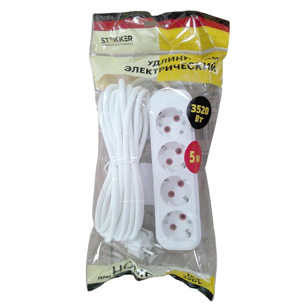Удлинители STEKKER 49360, серия Home, цвет белый, длина 5 м, количество розеток 4, сталь, сечение кабеля 1 мм2, тип кабеля ПВС, материал кабеля -, ток 16А, напряжение 250В, максимальная нагрузка 3520Вт, тип вилки - прямая. Диапазон рабочих температур +1.