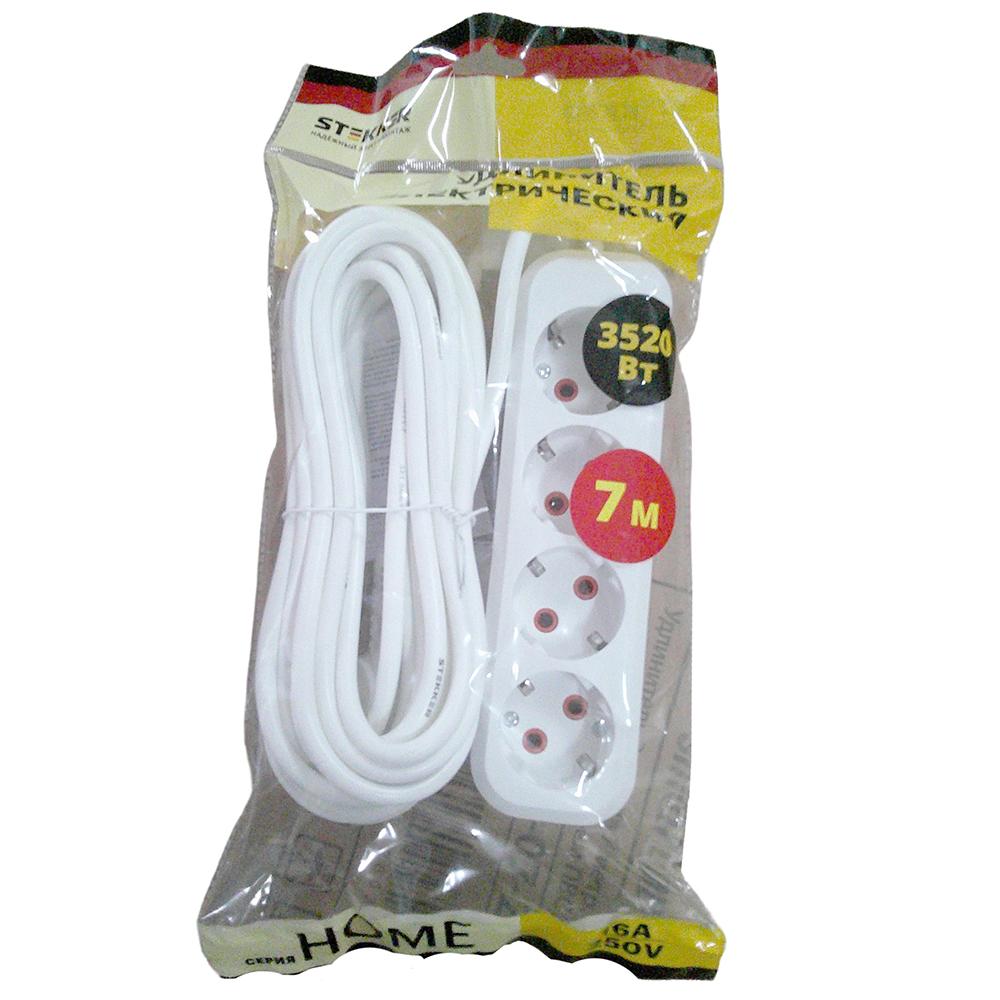 Удлинители STEKKER 49361, серия Home, цвет белый, длина 7 м, количество розеток 4, сталь, сечение кабеля 1 мм2, тип кабеля ПВС, материал кабеля -, ток 16А, напряжение 250В, максимальная нагрузка 3520Вт, тип вилки - прямая. Диапазон рабочих температур +1.
