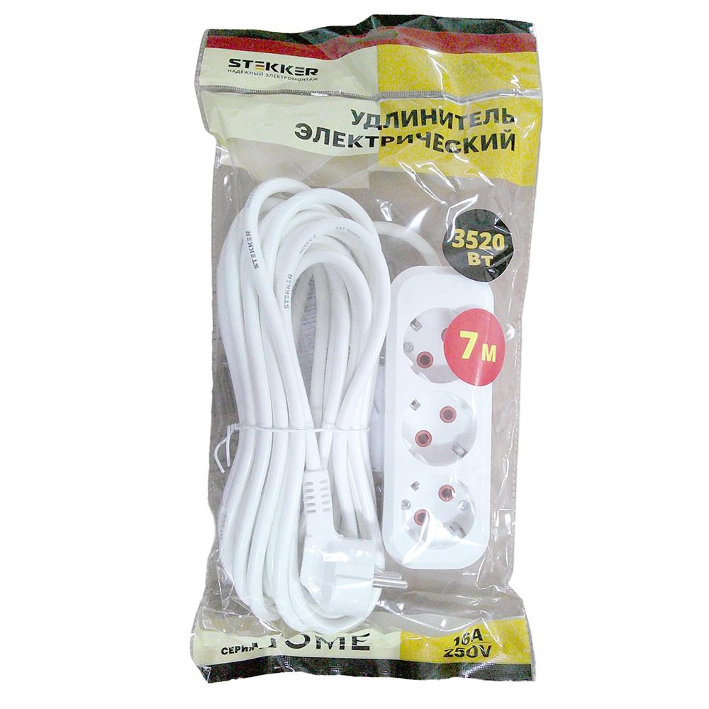 Удлинители STEKKER 49356, серия Home, цвет белый, длина 7 м, количество розеток 3, сталь, сечение кабеля 1 мм2, тип кабеля ПВС, материал кабеля -, ток 16А, напряжение 250В, максимальная нагрузка 3520Вт, тип вилки - прямая. Диапазон рабочих температур +1.