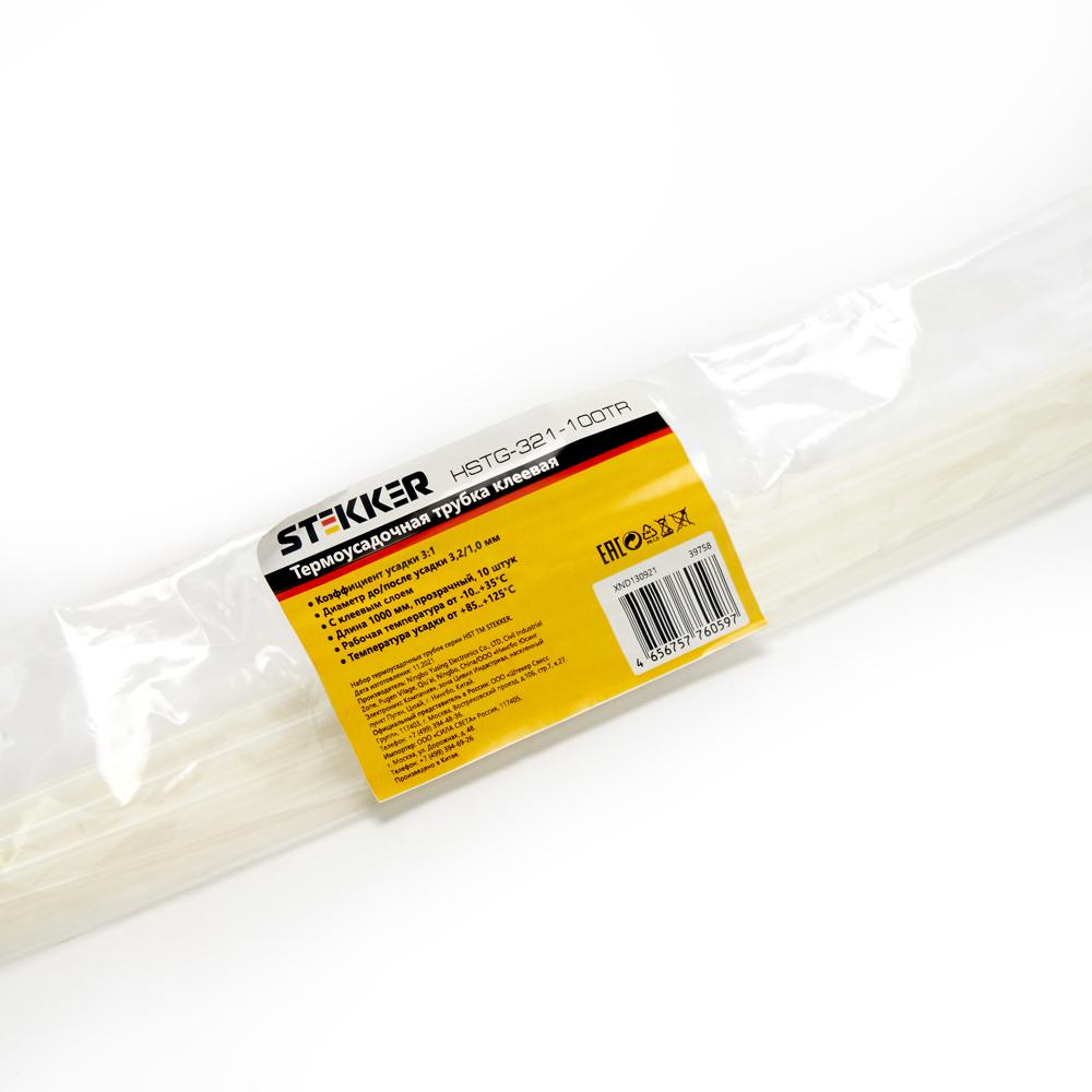 Термоусадочные трубки STEKKER HSTG-321-100TR, длина 1000мм. 10шт. в наборе, цвет: прозрачный. Коэффициент усадки 3:1, диапазон рабочих температур -10..+35°C, температура усадки +85..+125°C, номинальный ток 32А, для проводов сечением мм2.
