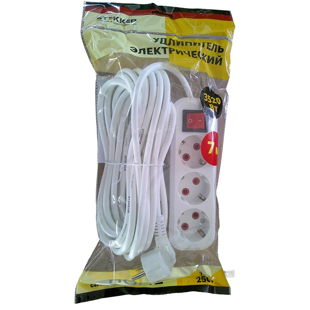 Удлинители STEKKER 49356, серия Home, цвет белый, длина 7 м, количество розеток 3, сталь, сечение кабеля 1 мм2, тип кабеля ПВС, материал кабеля -, ток 16А, напряжение 250В, максимальная нагрузка 3520Вт, тип вилки - прямая. Диапазон рабочих температур +1.