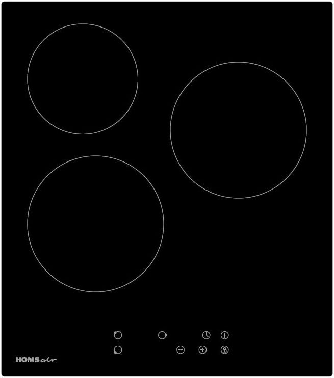 Встраиваемая электрическая панель HOMSair / Встраиваемая электрическая варочная панель, стеклокерамика,45 см, 3 конфорки, сенсорное управление, дисплей, таймер, блокировка панели, мощность конфорок 1200, 1800, 1800, черный цвет