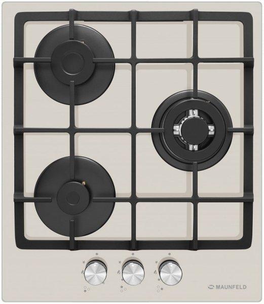 Встраиваемые газовые панели MAUNFELD / Встраиваемая варочаня поверхность, газ, ширина 45 см, 3 конфорки, WOK, чугунные решетки, газ-контроль, электроподжиг, мощность конфорок 1000,1700,3000, механическое управление, цвет бежевый