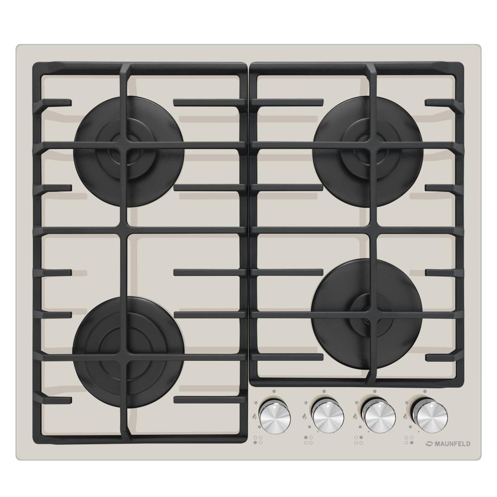 Встраиваемые газовые панели MAUNFELD / Встраиваемая варочная поверхность, газ, газ на стекле, ширина 60 см, 4 конфорки, чугунные решетки, газ-контроль, электроподжиг,цвет бежевый