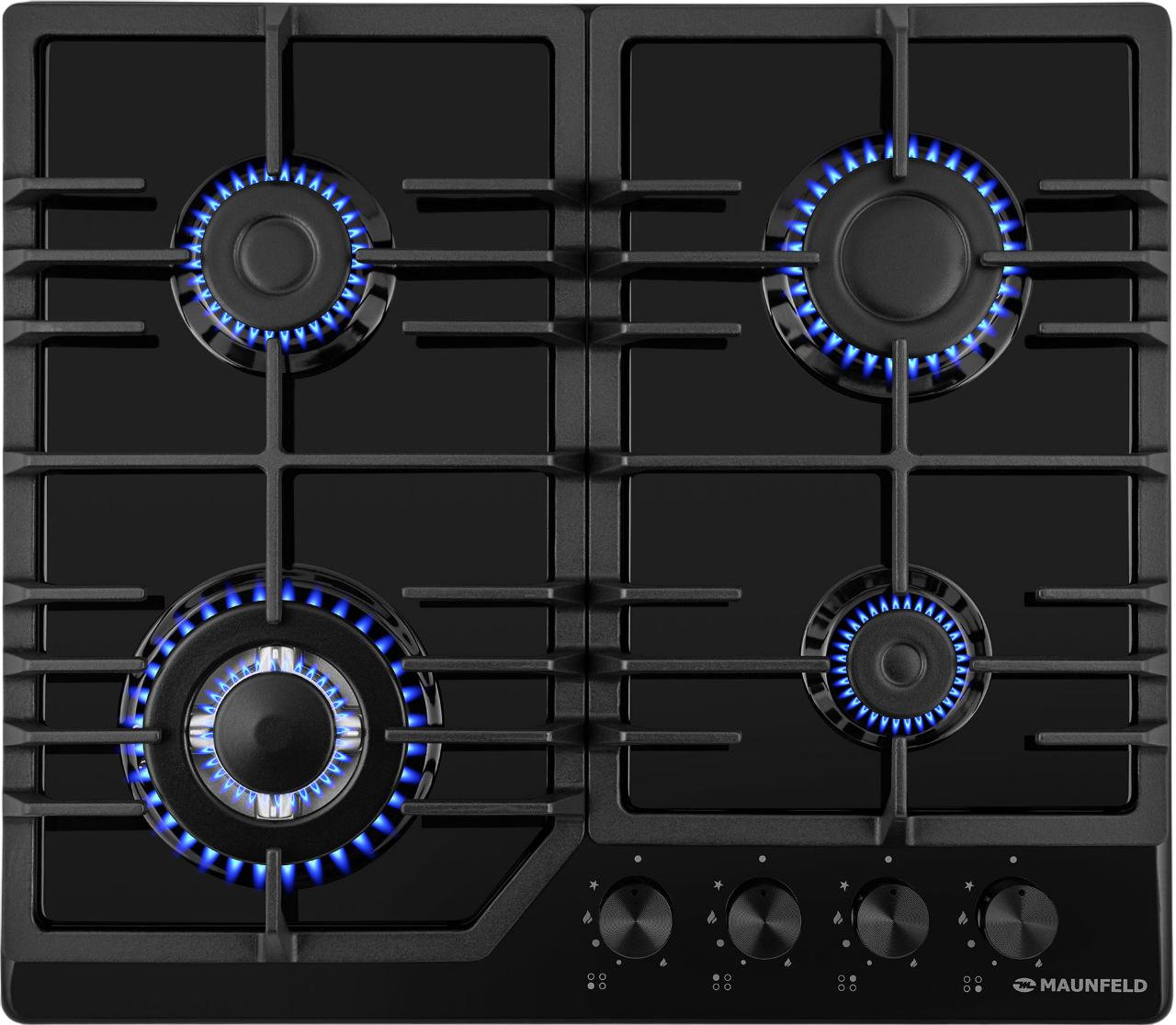 Встраиваемые газовые панели MAUNFELD / Варочная панель, газ, 60 см, механическое управление, 4 конфорки, электроподжиг, газ-контроль, WOK-конфорка, черный