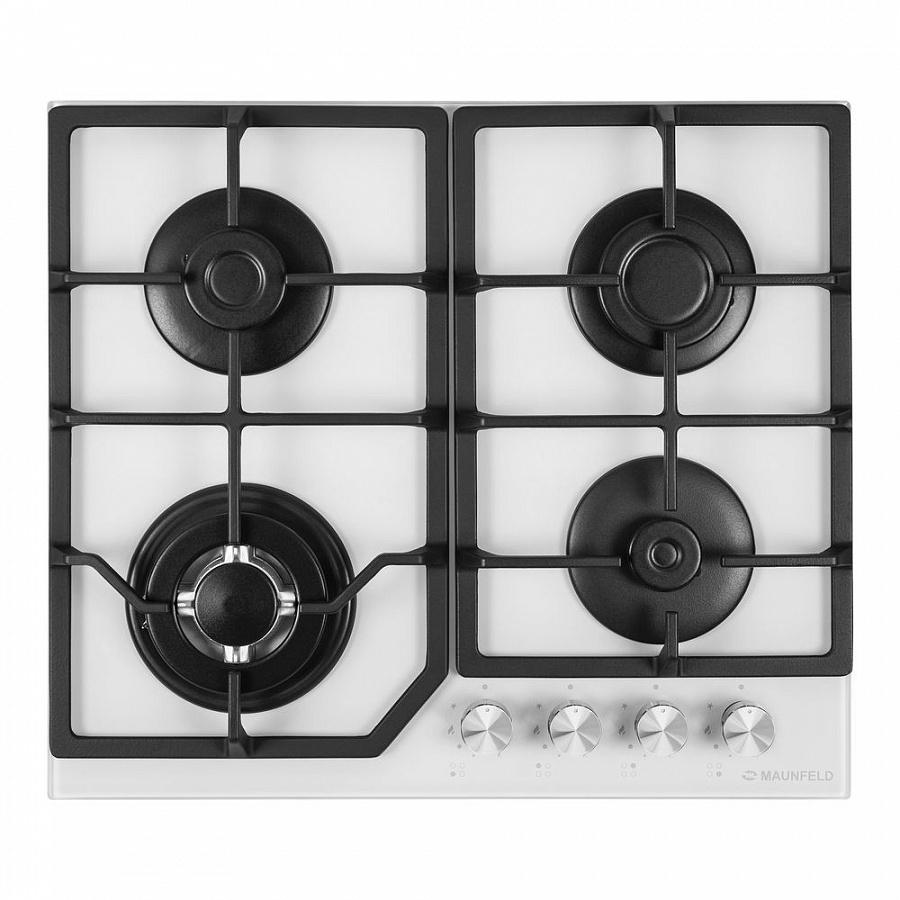 Встраиваемые газовые панели MAUNFELD / Газ, Тип: газовая 60см, Независимая, Переключатели поворотные, Конфорки 4 шт, Газ-контроль, Электроподжиг, WOK, Жаропрочное стекло, Чугунные решетки, Белый