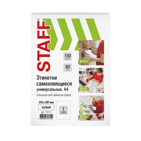 Этикетка самоклеящаяся 210х297 мм, 1 этикетка, белая, 80 г / м2, 100 листов, STAFF, 115173