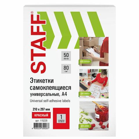 Этикетка самоклеящаяся 210х297 мм, 1 этикетка, красная, 80 г / м2, 50 листов, STAFF, 115229