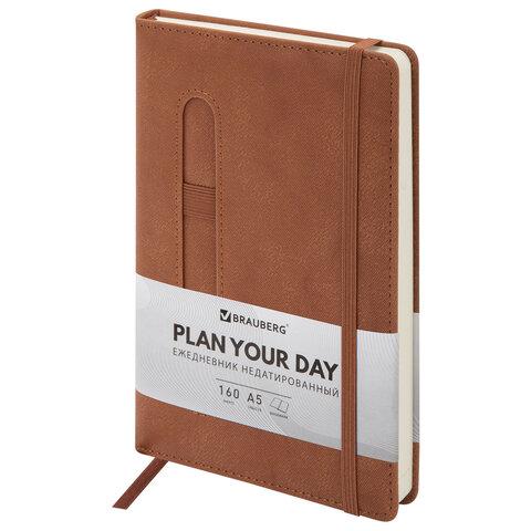 Ежедневник недатированный А5 148x218 мм BRAUBERG "Optimal", под кожу, 160 листов, резинка, держатель для ручки, коричневый, 118643