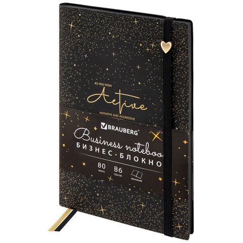 Блокнот B6 130x184мм BRAUBERG "Stellar", под кожу, 80 листов, фольга, резинка, клетка, черный, 118652