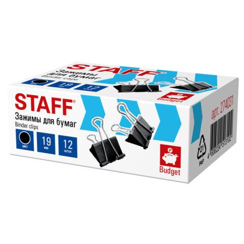 Зажимы для бумаг STAFF ECO, КОМПЛЕКТ 12 шт, 19 мм, на 60 листов, черные, картонная коробка, 274031