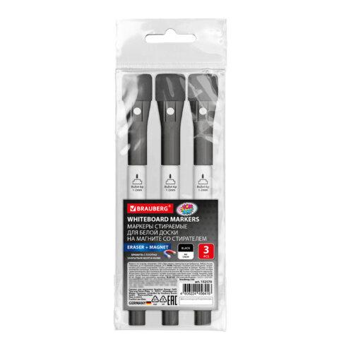 Маркеры на магните со стирателем для белой доски и планера, 3 шт., черные, BRAUBERG POP-ART, 1-2 мм, 152570