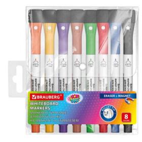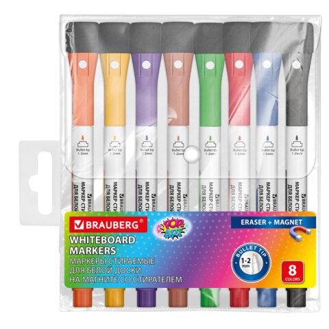 Маркеры на магните со стирателем для белой доски и планера, 8 цветов, BRAUBERG POP-ART, 1-2 мм, 152567