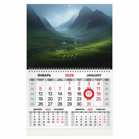 Календарь квартальный 2026 г., 1 блок, 1 гребень, магнитный курсор, мелованная бумага, BRAUBERG, "Долина", 116914