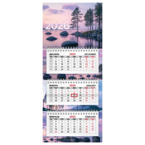 Календарь квартальный 2026 г., 3 блока, 3 гребня, бегунок, мелованная бумага, BRAUBERG EXTRA MINI, "Озеро", 116839