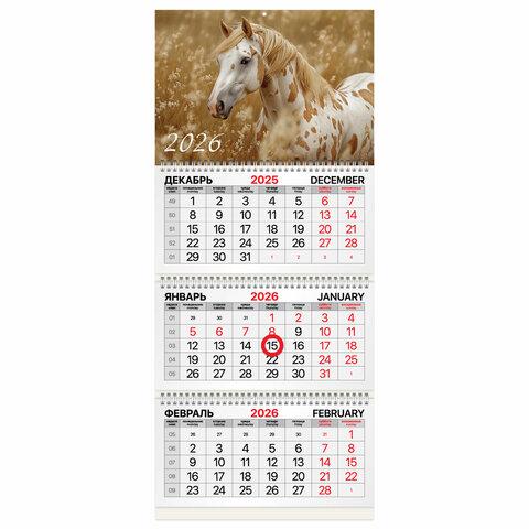 Календарь квартальный 2026 г., 3 блока, 3 гребня, бегунок, мелованная бумага, BRAUBERG EXTRA MINI, "Конёк", 116838