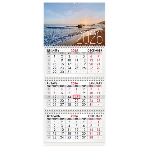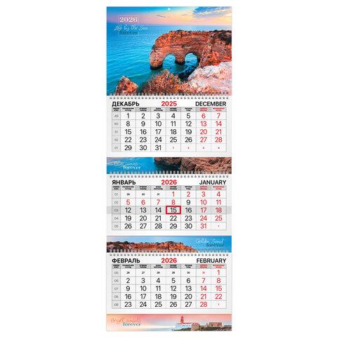 Календарь квартальный на 2026 г., 3 блока, 3 гребня, бегунок, мелованная бумага, BRAUBERG, "Морской пейзаж", 116807