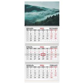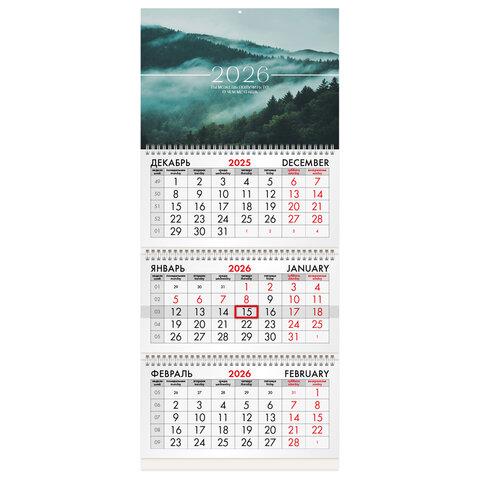 Календарь квартальный на 2026 г., 3 блока, 3 гребня, бегунок, мелованная бумага, BRAUBERG, "Туманный лес", 116808