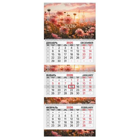 Календарь квартальный 2026 г., 3 блока, 3 гребня, бегунок, мелованная бумага, BRAUBERG EXTRA, "Цветы", 116811