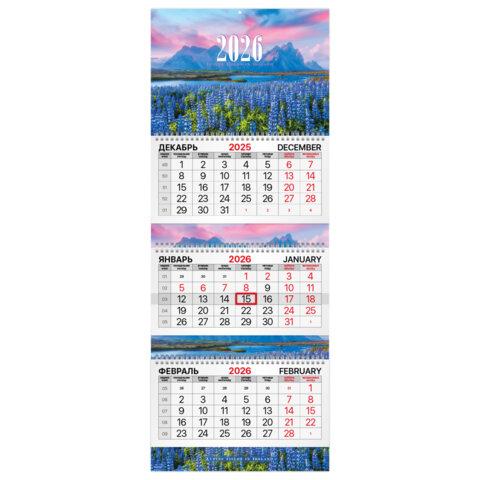 Календарь квартальный 2026 г., 3 блока, 3 гребня, бегунок, мелованная бумага, BRAUBERG EXTRA, "Люпины", 116825