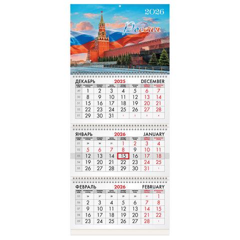 Календарь квартальный 2026 г., 3 блока, 3 гребня, бегунок, мелованная бумага, BRAUBERG EXTRA, "Символика РФ", 116827