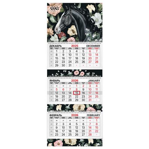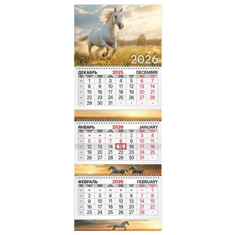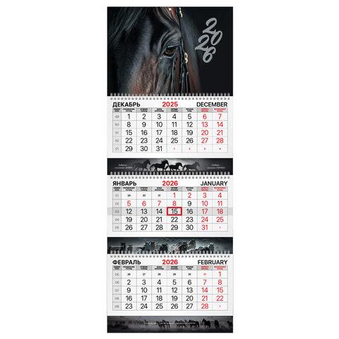 Календарь квартальный 2026 г., 3 блока, 3 гребня, бегунок, мелованная бумага, BRAUBERG EXTRA, "Лошадь", 116813