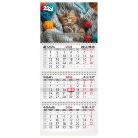 Календарь квартальный на 2026 г., 3 блока, 3 гребня, бегунок, мелованная бумага, BRAUBERG, "Котенок", 116805