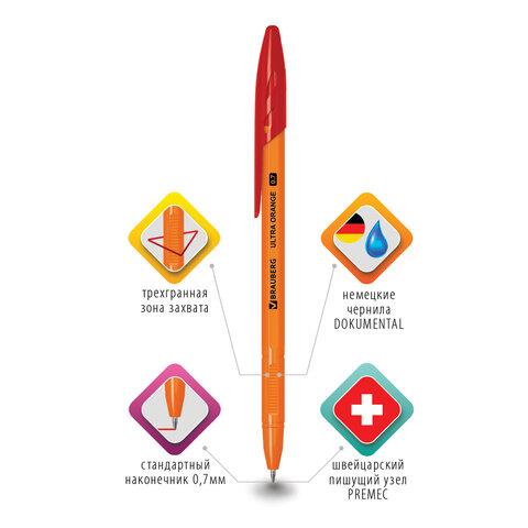 Ручка шариковая BRAUBERG "ULTRA ORANGE", КРАСНАЯ, узел 0,7 мм, чернила ГЕРМАНИЯ, наконечник ШВЕЙЦАРИЯ, 143564