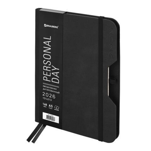 Ежедневник датированный 2026, А5, 151х213 мм, BRAUBERG "Note", под кожу, держатель для ручки, черный, 117516