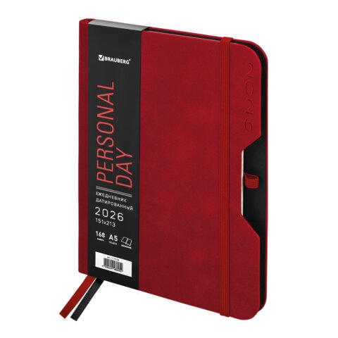 Ежедневник датированный 2026, А5, 151х213 мм, BRAUBERG "Note", под кожу, держатель для ручки, красный, 117518
