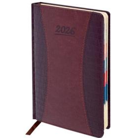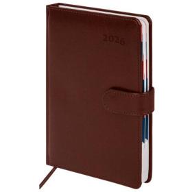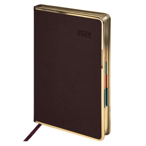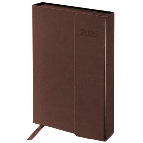 Ежедневник датированный 2026, А5, 138x213 мм, BRAUBERG "Optimal", под кожу, резинка, держатель для ручки, коричневый, 117468