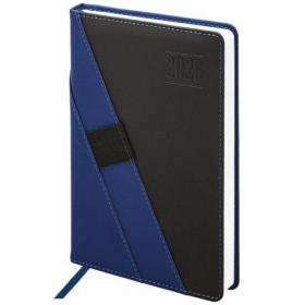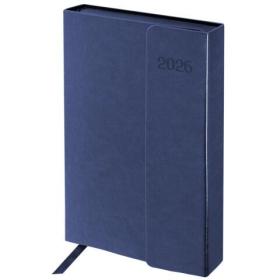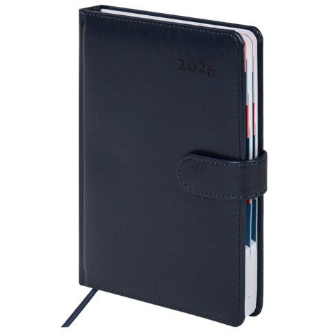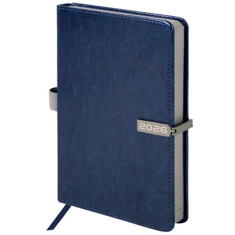 Ежедневник датированный 2026, А5, 138x213 мм, BRAUBERG "Optimal", под кожу, резинка, держатель для ручки, синий, 117464