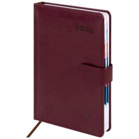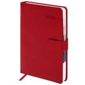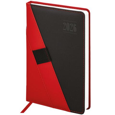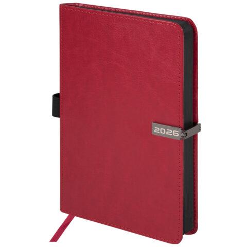 Ежедневник датированный 2026, А5, 138x213 мм, BRAUBERG "Optimal", под кожу, резинка, держатель для ручки, красный, 117466