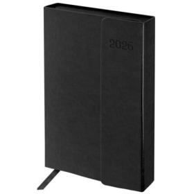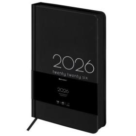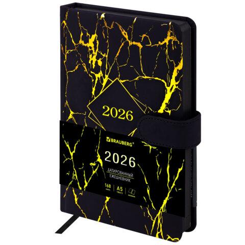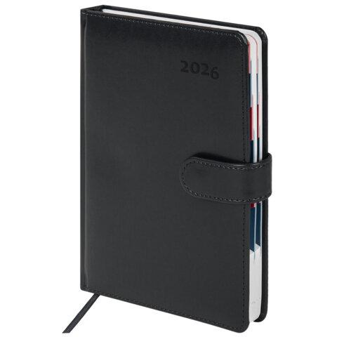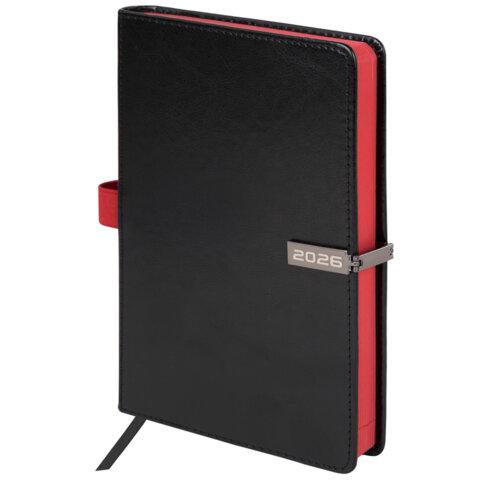 Ежедневник датированный 2026, А5, 138x213 мм, BRAUBERG "Optimal", под кожу, резинка, держатель для ручки, черный, 117465