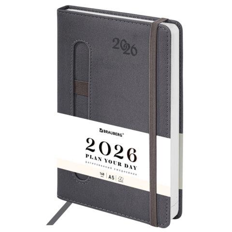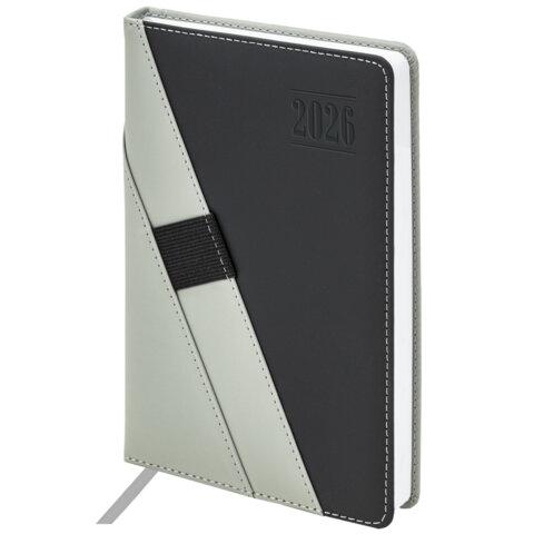 Ежедневник датированный 2026, А5, 138x213 мм, BRAUBERG "Optimal", под кожу, резинка, держатель для ручки, серый, 117469