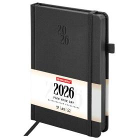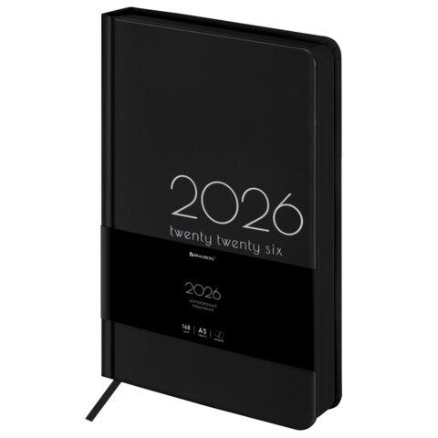 Ежедневник датированный 2026, А5, 138х213 мм, BRAUBERG "Plain", под кожу, резинка, держатель для ручки, черный, 117505