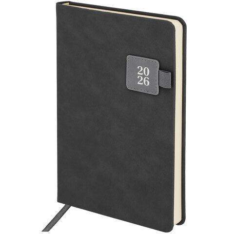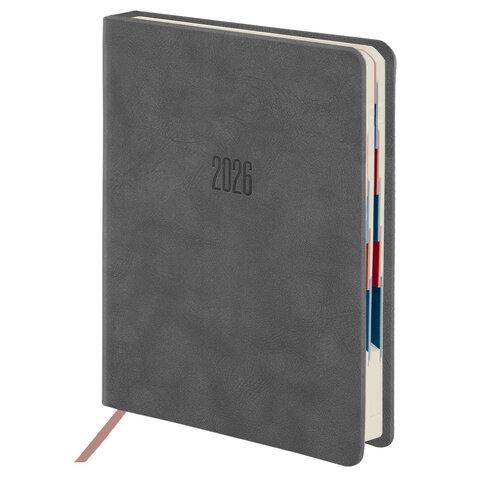 Ежедневник датированный 2026, А5, 138х213 мм, BRAUBERG "Essential", под кожу, держатель, серый, 117397