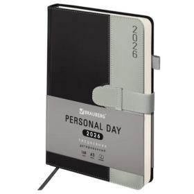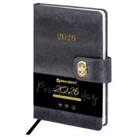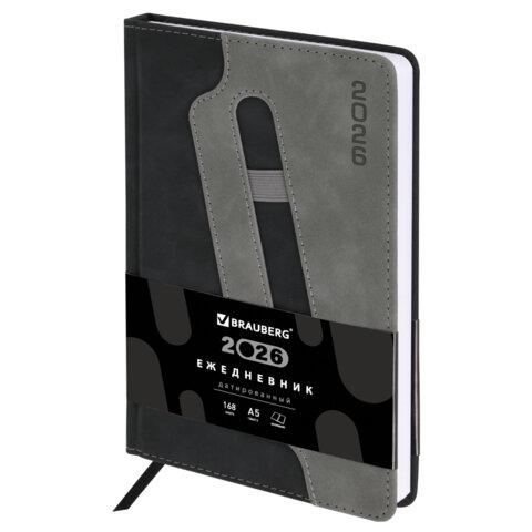 Ежедневник датированный 2026, А5, 138х213 мм, BRAUBERG "Esthetic", под кожу, держатель для ручки, застежка, черный / серый, 117372