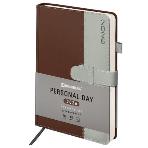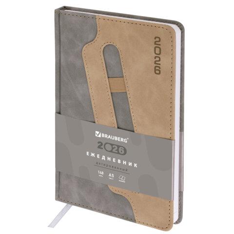 Ежедневник датированный 2026, А5, 138х213 мм, BRAUBERG "Esthetic", под кожу, держатель для ручки, застежка, коричневый / серый, 117374