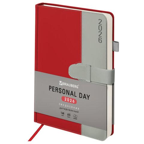 Ежедневник датированный 2026, А5, 138х213 мм, BRAUBERG "Esthetic", под кожу, держатель для ручки, застежка, красный / серый, 117371