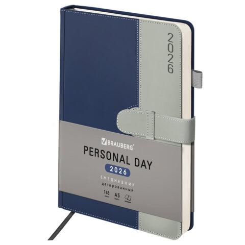 Ежедневник датированный 2026, А5, 138х213 мм, BRAUBERG "Esthetic", под кожу, держатель для ручки, застежка, синий / серый, 117373