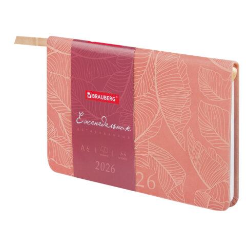 Еженедельник датированный 2026 МАЛЫЙ ФОРМАТ 95х155 мм, А6, BRAUBERG "Foliage", под кожу, розовый, 117199