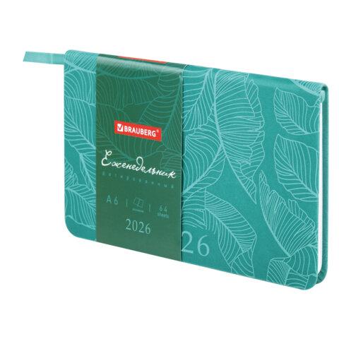 Еженедельник датированный 2026 МАЛЫЙ ФОРМАТ 95х155 мм, А6, BRAUBERG "Foliage", под кожу, бирюза, 117197