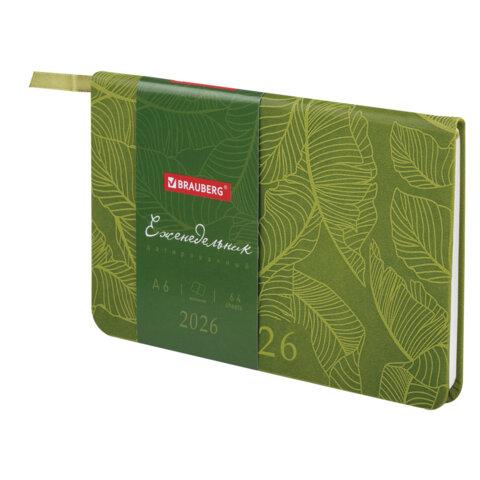 Еженедельник датированный 2026 МАЛЫЙ ФОРМАТ 95х155 мм, А6, BRAUBERG "Foliage", под кожу, зеленый, 117198